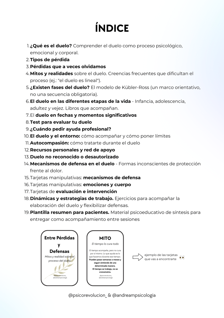 Diseñado tanto para profesionales de la salud mental como para personas que atraviesan una pérdida, este recurso integra una mirada emocional, corporal y relacional del duelo, facilitando la comprensión de las reacciones internas que pueden aparecer para protegernos.
