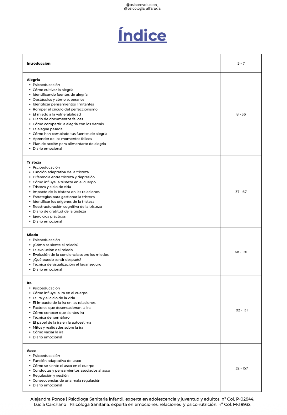Dossier en formato PDF de 159 páginas, organizado en secciones dedicadas a cada emoción: alegría, tristeza, miedo, ira y asco.
